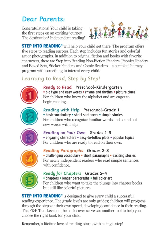 Step 1 Readers feature big type and easy words for children who know the alphabet and are eager to begin reading. Rhyme and rhythmic text paired with picture clues help children decode the story.