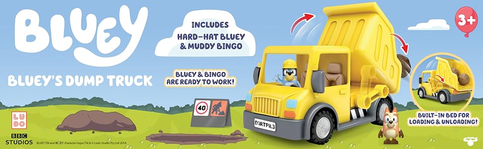 Bluey : Bluey’s Dump Truck with Hard Hat Bluey and Muddy Bingo Figures