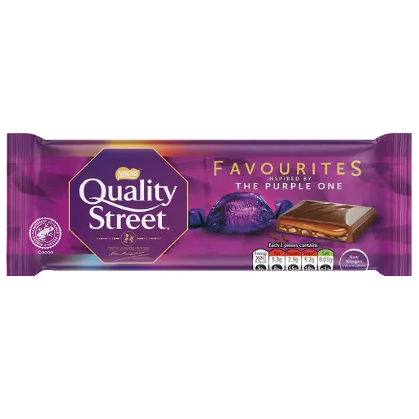 Inspired by the Purple One Quality Street, a delicious milk chocolate shell containing runny caramel and hazelnut pieces. What’s your favourite Quality Street®? The new Purple One sharing block is inspired by one of the nations favourite Quality Street sweets and brings you a new way to share Quality Street. Our iconic selection of sweets has been bringing people together since 1936. John Macintosh, the owner of a successful confectionery business in Norwich, sold a deliciously chewy new toffee invented by his wife. When his son inherited the business, he soon created a range of sweets in beautiful wrappers that everyone could enjoy – and Quality Street® was born. Quality Street is part of the Nestlé Cocoa Plan, supporting farmers for better chocolate. Nestlé and the Rainforest Alliance work together to help improve the lives of cocoa farmers and the quality of their product