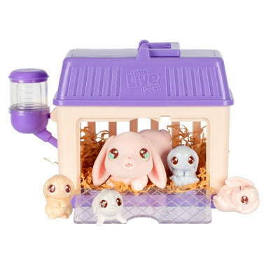Little Live Pets Mama Surprise Minis takes nurturing play to the next level! Available in Hamsters and Bunnies, these precious pets are about to become Mamas, but the big question is, when? First, make a cozy bed for Mama and the babies with the straw. Fill the water bottle in the hutch and wait. Your child will be amazed as they watch the bottle empty and see the babies revealed! How many will arrive? 2, 3, or 4 tiny babies! Each baby arrives with its own unique pose and personality. Complete the birth certificate for a truly unique experience. Mama Surprise Minis is a repeatable playset, so the surprise and delight of welcoming new babies can happen again and again!