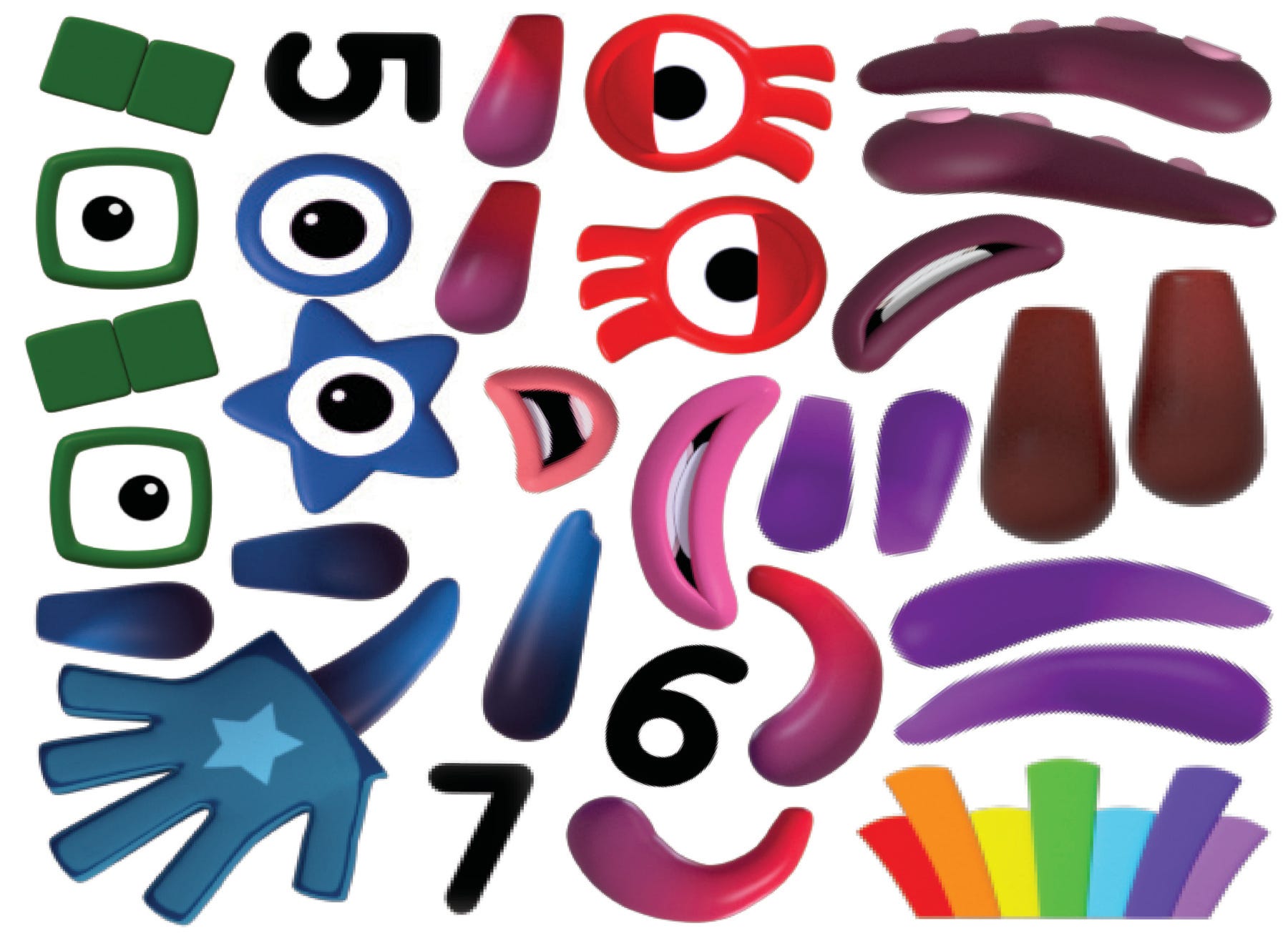 8 sheets of Clings that include Numberblocks 1–10 and their arms, legs, and facial features as well as additional poses for characters Four, Five, Six, Eight, Nine, and Ten