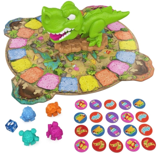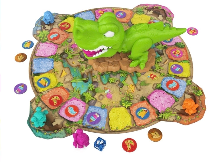 HUNT AND GATHER FUN: Gather 2-4 players ages 5+ who love snacks, jungle adventures, and dodging dino tongues to collect the yummy snacks, like tasty taco-dactyl and prehistoric pizza, along their path.