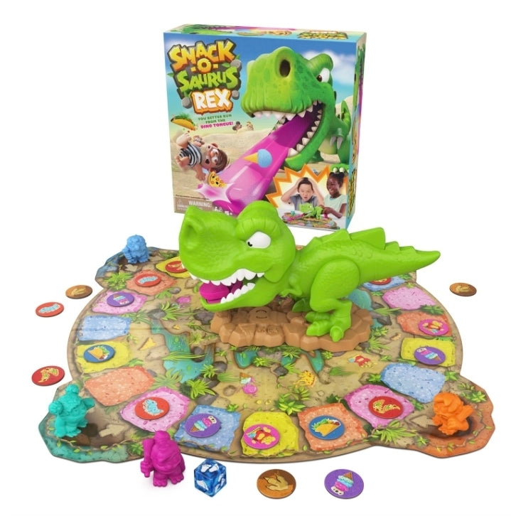 You better run from the dino tongue! Help hungry cavepeople - Ogg, Bogg, Grogg, and Shirley - hunt for food while avoiding the legendary Snack-O-Saurus Rex! As a snack-loving dino, he`ll grab extra grub when you launch his super-long tongue. But be careful: you might lose some snacks when his tongue hits you! Players can aim the dino to snatch a snack or work with the t-rex by aiming at an opponent to knock them back. Spin Master brings the fun home by offering a range of toys & games, family games, family board games, kids toys, children`s games, toddler toys, games for adults, card games for adults, adult games, baby toys, toys for girls, and board games. Collect your favorite toys, stuffed animals, fidget toys, RC cars, action figures, dolls & accessories, and more. From special 4 year old girl birthday gifts to boys toys 6-8 years old, find birthday gifts for boys and girls and toys for ages 5-7 by shopping our diverse catalog of games and toys. Still hungry for more? gaming? Explore travel games, kids games, jigsaw puzzles for adults or card games for game night for all ages. For 2-4 players, ages 5 and up.