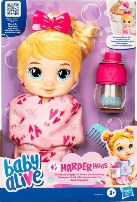 Harper Hugs can't wait for her first shampoo with the Shampoo Snuggle baby doll playset! Her shampoo bottle accessory has fun disappearing bubbles and features 3 ways to play: on its own, with water, or with your own kids shampoo. She has a tuft of brushable hair on top of her head and an adorable built-in bathing suit that makes her perfect for water play. Wrap her in her towel with fasteners for extra snuggle, then style her hair tuft with the comb and removable bow. With so much water fun on the way, this adorable companion makes a great baby doll toy for girls & boys 3 years and up. Baby Alive and all related properties are trademarks of Hasbro.