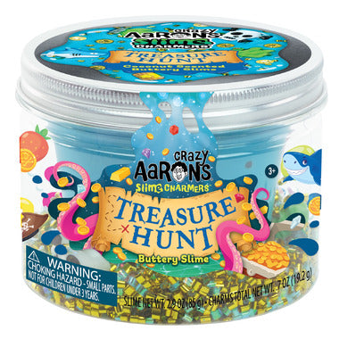 Embark on an adventure with Crazy Aaron’s® Treasure Hunt Slime Charmers™! This smooth, Coconut scented, blue butter slime is packed with gold bingsu beads and hidden treasure charms waiting to be discovered. Dig through the slime, uncover your treasures, and let the hunt for fun begin!