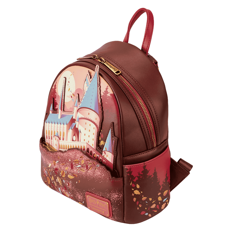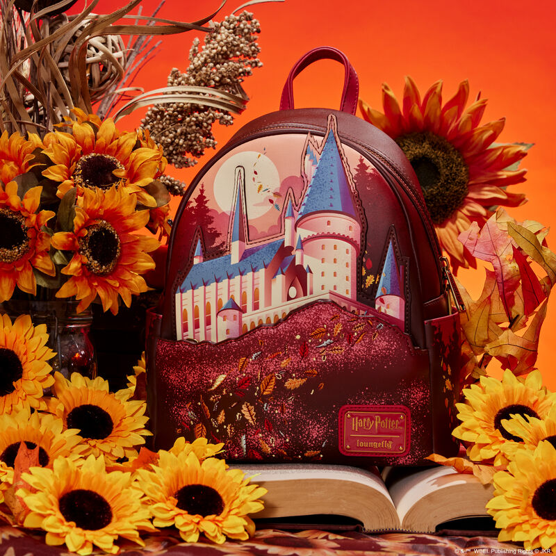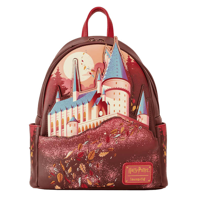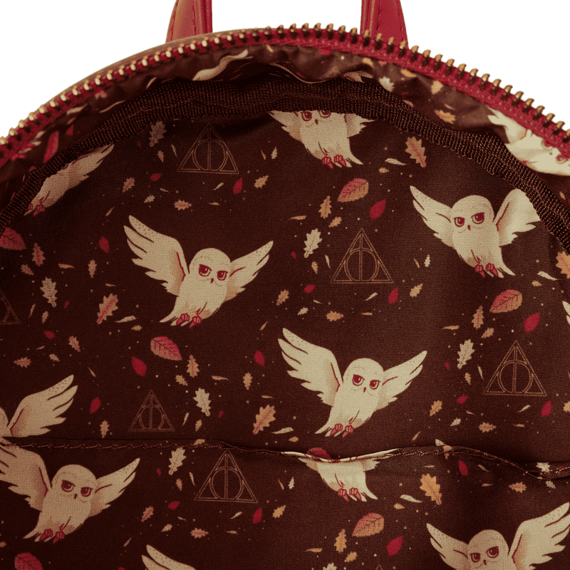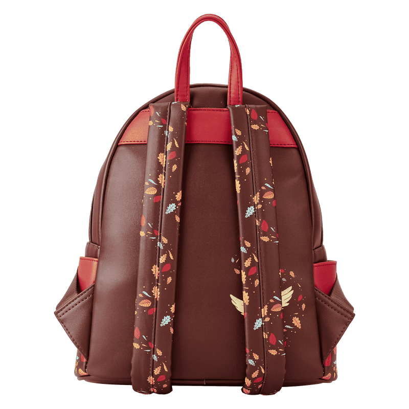As fall leaves flutter, and pumpkin spice fills the air, journey to Hogwarts School of Witchcraft and Wizardry™ in style. Take along our Loungefly Warner Bros. Harry Potter™ Hogwarts School of Witchcraft and Wizardry Fall Mini Backpack! The classic Hogwarts design takes on a cozy cottage feel, with embroidered fall leaves that flutter and swirl in the foreground and background. A hidden zipper pocket, behind the leaves on the front, creates extra room for securing smaller items on your travels. Even the side pockets and shoulder straps are filled with fall colors and leaves. On the back, Hedwig takes flight among the foliage. All wands at the ready! Turn all your journeys into fantastic adventures.