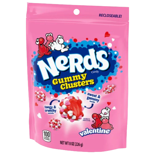NERDS Gummy Clusters are tangy, crunchy, sweet, gummy candy in a fun poppable, bite-sized goodness. Sweet and gummy on the inside, tangy and crunchy on the outside. Valentine's baby NERDS surround fruity, gummy centers. Each NERDS gummy cluster is a crunchy, chewy, sweet, and tangy explosion of flavors. Pop a cluster, packed with tangy, crunchy NERDS – candy so tasty, there aren't even words. NERDS Gummy Clusters have tangy, crunchy, mini clustered around a sweet gummy center for a poppable tasty bite.