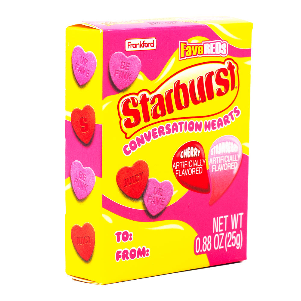 - Indulge in the irresistible sweetness of Valentine's Day candy with the delicious Strawberry and Cherry flavors of Starburst in this Starburst FaveReds Conversation Hearts special 0.88oz box set.