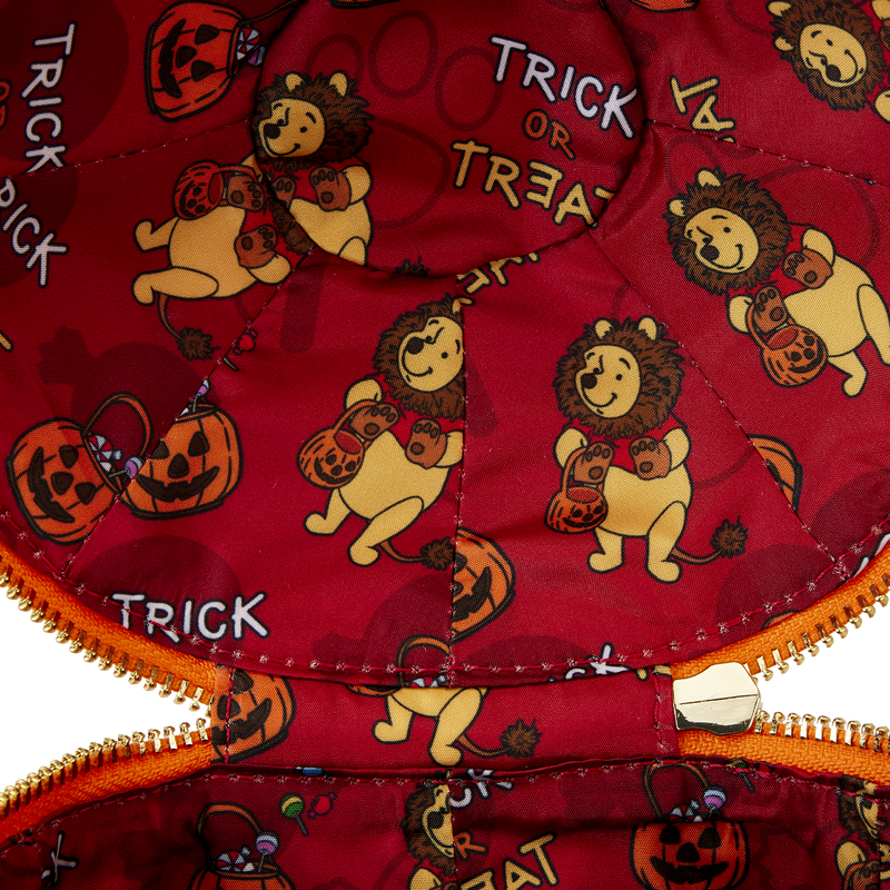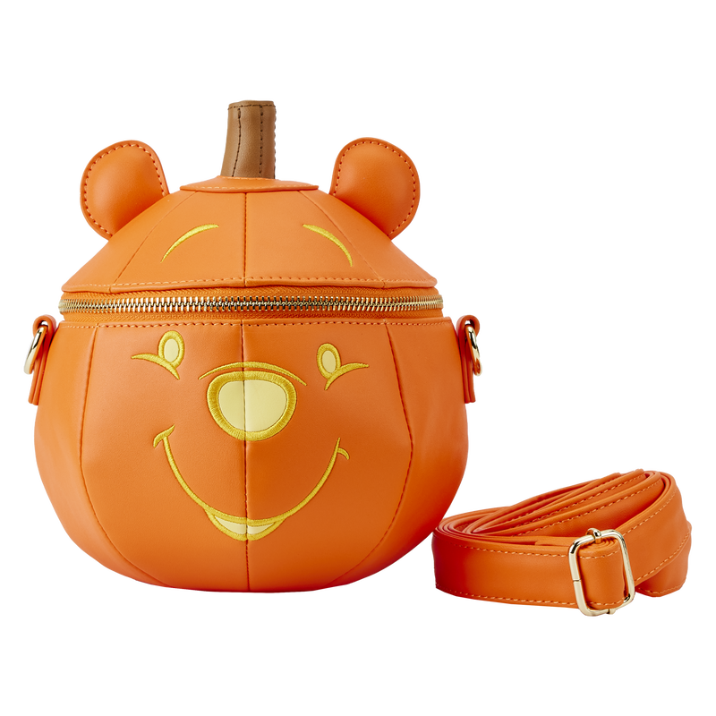 The Loungefly Winnie the Pooh Pumpkin Crossbody Bag is made of vegan leather (polyurethane). Bag has adjustable (detachable) shoulder strap and sturdy metal hardware. Additional features include applique, embroidered, glow-in-the-dark, and printed details. Take note of the coordinating inside lining.